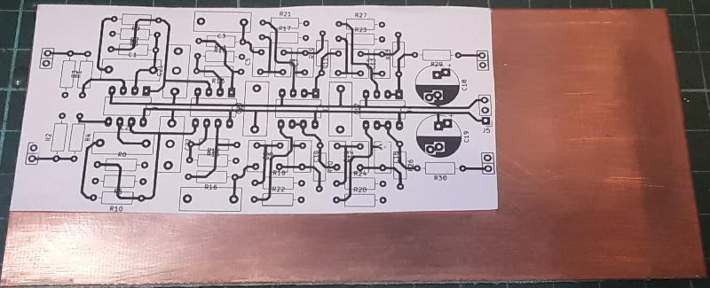 Then I printed the copper traces as seen from the solder side (reversed) and stuck that to the non-copper side.
