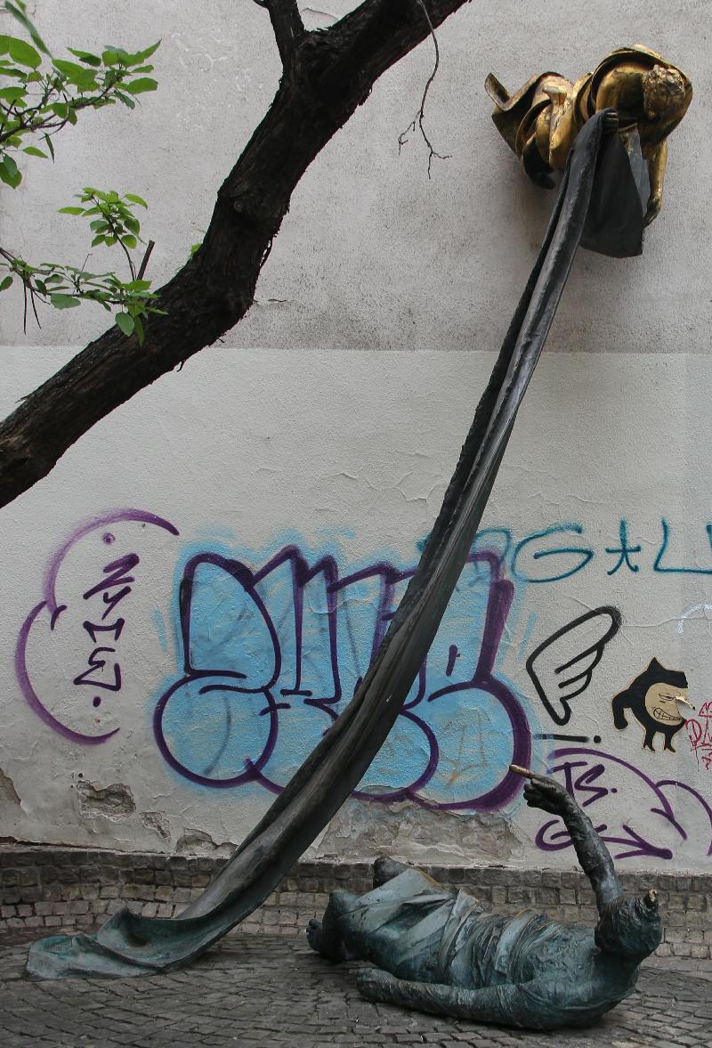 It started out as a Russian hat on a pillow, but a politician called Erik Fülöp took an axe to it, knocked it off the fence, and threw it in the river. Kolodko replaced the statue with an axe on a pillow (more on this later).