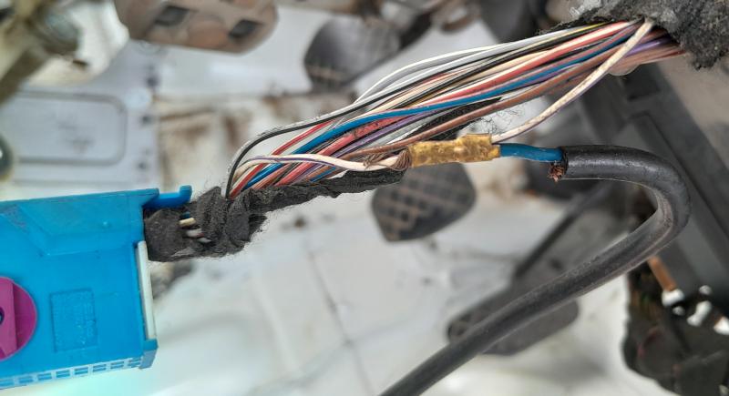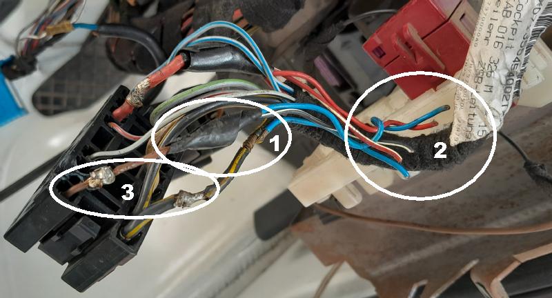 This guy did a slightly better job, he used the back half of a crimp connector to connect his repurposed household twin (i.e. mains) wire to the white/lilac (being lights) wire to the cluster.