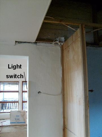 OK, all of this sounds terribly confusing, and the wiring is also rather… complicated. Especially since the best way to hide the wire for the downlighters is to take it from the switch up into the ceiling, around to the other switch, then down, under the bath, and up the height of the old doorway… yes, this is the easy way… trust me.