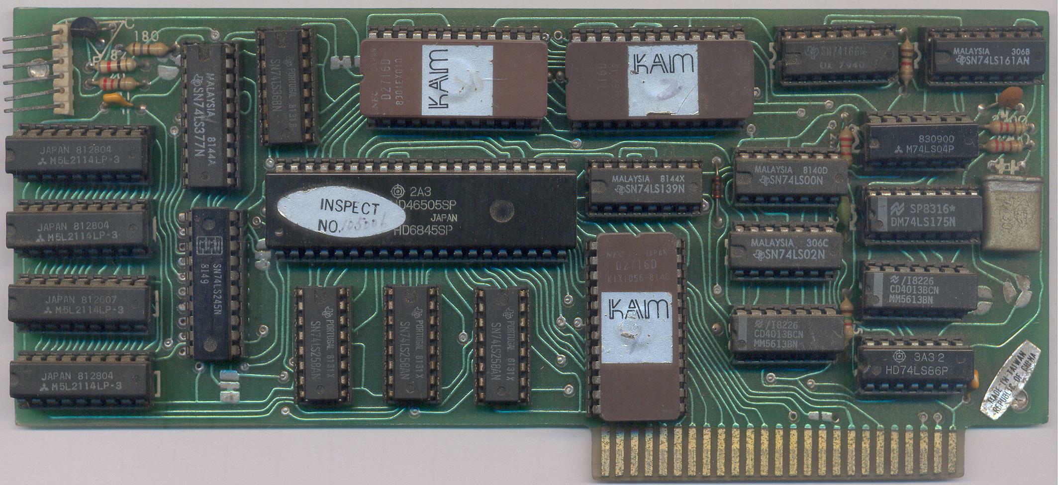 But more interesting, compare the traces to the Unitron 80 Column Card on AppleLogic. It's clear that that card is a direct (as in, same artwork) descendant of this one. So this might be a first-gen Unitron, before they got their act together? Or, KAM copied the Videx, and Unitron copied KAM? (The Unitron combines the two 2716 character generators into one 2732).
