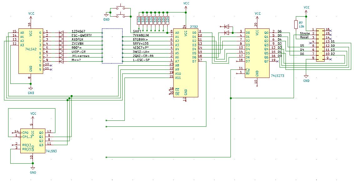 The 74LS93 counts from 0 to 7, causing the 74LS42 to scan the keyboard matrix. The EPROM is (quite wastefully, but it works) programmed at all the addresses where only one of A1 to A7 is a zero. If you look at the image, the first memory location that's not 0xFF is 0x07E (0b000 0111 1110 which corresponds to both SHIFT on A0 and "1" on A7 being pressed*) and the value at that location is 0x21 = "!". The next value, where SHIFT is not pressed, is of course "1".