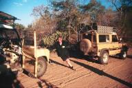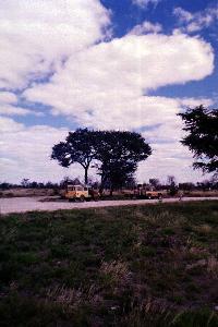 ... we reach the foot & mouth checkpoint. "What's that?" asks the man, pointing at Elmari's carefully wrapped, purchased in Livingstone, Zambian drum. "A drum", sez Elmari. "Not allowed, animal product", sez man. Much arguing ensues, until Elmari loses her cool, pumps herself up to her full 5'4½", and shouts at the fellow : "Jou MOER!". He backs down, we give him beer, and off we go.