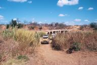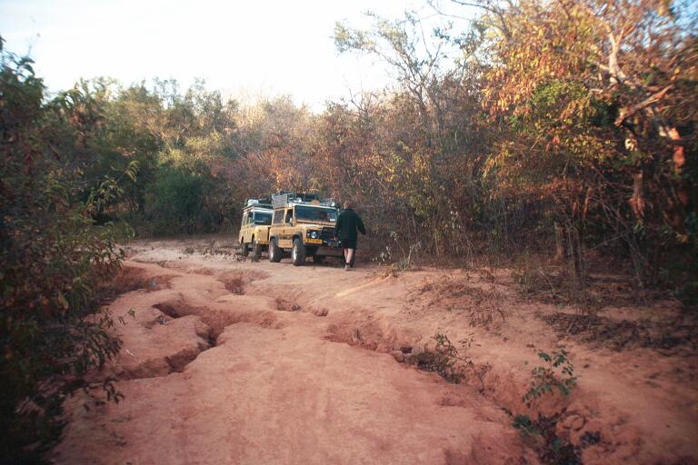 I hear a (new) strange noise, and investigate. Hmmm, the bolt holding the spring shackle to the chassis is broken. And this was a new bolt, well, new in Land-Rover terms, less than three years old. We decide it must have been the Sesheke road, I bum a long bolt off Pim and fix the thing.