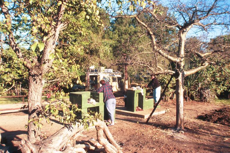 We had previously arranged to meet up with Manfred & co at Jolly Boys backpackers, so of course we go there, where we get the message that they had gone to the Waterfront, where we managed to catch up with them. The Waterfront is (surprise) on the river, with some really nice (but of course expensive) lodges. The campsites are not so nice, though, laid out for big overland trucks, with the toilets way over on the other side.