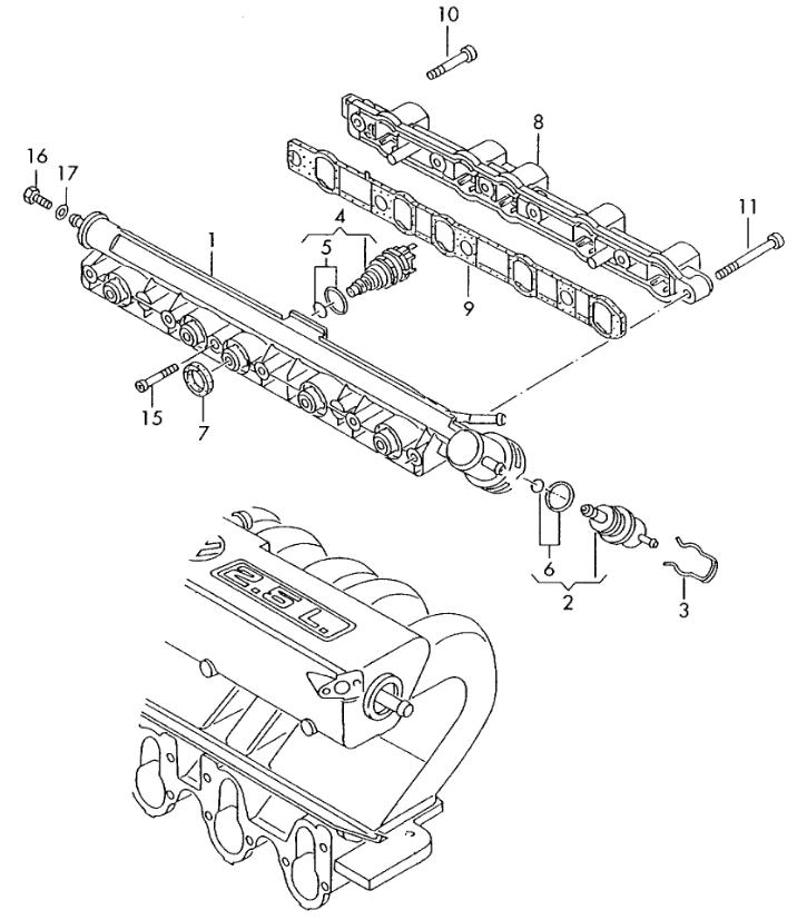 1 023133322A Fuel rail 1 2 037133035C Fuel pressure regulator 1 3 037133047A Retaining clip 1 4 044906031 Injection valve 5 5 996133002 Bearing seal 1 6 037198031 Gasket set for pressurecontroller 1 7 037133398A seal ring 5 8 22S133313 Fuel line 1 9 023971786 Seal 1 10 N0147495 Socket head bolt with hexagon socket head M6X40 1 11 N10059801 Socket head bolt with hexagon socket head M6X70 5 15 N0141531 fillister hd. bolt 5X40X25 1 16 N0102017 Hexagon bolt M4X8 1
