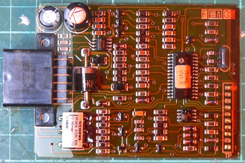 Top view. It's a lot of components for a simple function. The PIC16C57 processor is labelled "VWKL VN1.3", I would speculate that the working name for this unit is most likely "VWKL" and the firmware is obviously V1.3. Resonator is 4 MHz. The V23026-D1025-B201 relay is from Siemens, it's a SPDT unit with a 9V coil. The chip at the top left is an L4949 5V regulator, and the transistors are marked "5Cp" and "6C" which makes them BC807 and BC817 respectively.