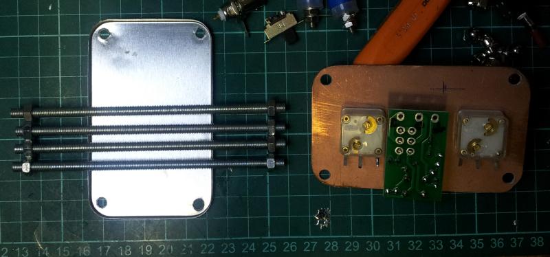 I used the label that came with the kit as a drilling template for the two capacitors. I'm discarding the switch, of course, and using the BLT arrangement.